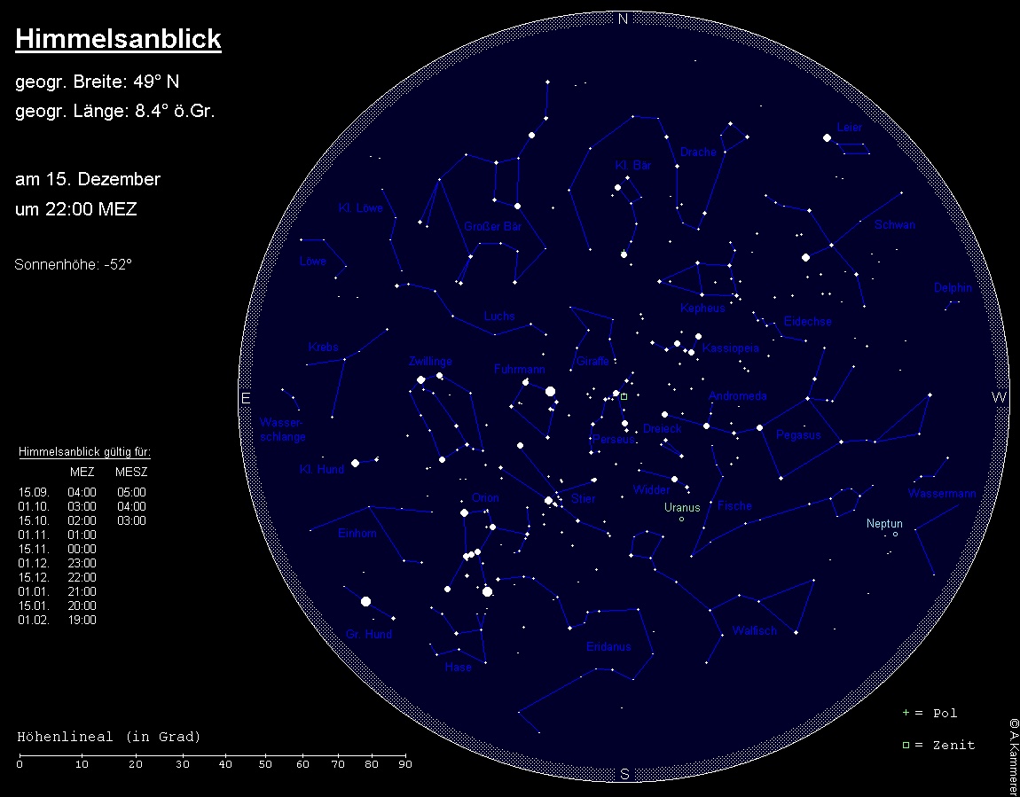 wandert langsam rückläufig durch das Sternbild Widder. Im Fernglas ist der 5.7m helle Planet ein einfaches Objekt und im Teleskop sind das kleine Scheibchen und die zwei hellsten Monde noch immer lohnende Objekte. Sein Meridiandurchgang verlagert sich von 21:45 MEZ auf 19:45 MEZ. Am Mittag des 8. Dezember passiert der Mond den Planeten in 5° südlichem Abstand, hat sich aber bei Einbruch der Nacht schon so weit vom grünlichen Planeten entfernt, dass die beiden nicht mehr gemeinsam in einem Fernglas-Gesichtsfeld sichtbar sein.