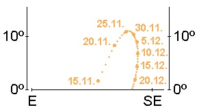 kann bis etwa zum 10. Dezember – gegebenenfalls unter Zuhilfenahme eines Fernglases – noch so eben tief über dem Südwesthorizont in der hellen Abenddämmerung ausgemacht werden. Am ehesten sollte man den –1.8m hellen Planeten gegen 17:00 Uhr suchen. Am 27. Dezember steht der Gasplanet dann in Konjunktion mit der Sonne.