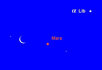 ist ein gut sichtbares, aber mit einer Helligkeit von 1.6m noch eher unauffälliges Objekt am Morgenhimmel. Er wandert durch das Sternbild Waage und passiert am 12. Dezember den 2.6m hellen Doppelstern Zubenelgenubi (a Lib) in 0.3° nördlichem Abstand. Am 23. Dezember findet man die Mondsichel 3° links des roten Planeten. Teleskopisch hat das erst 4.3“ große Scheibchen noch nichts zu bieten.