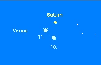 ist noch immer kein auffälliges Objekt am frühen Abendhimmel, doch erreicht sie Anfang Dezember den südlichsten Punkt auf der Ekliptik und strebt von da an langsam wieder nordwärts. Der Untergang der –4.0m hellen Venus verlagert sich im Laufe des Monats von 18:00 MEZ auf 19:00 MEZ. Am 11. Dezember zieht der hellste Planet am recht unauffällig gewordenen Saturn in 1.8° südlichem Abstand vorüber. Am Abend des 28. Dezember steht die schmale Mondsichel knapp 5° rechts unterhalb des Planeten, am 29. Dezember links oberhalb.