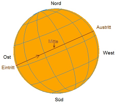 wandert am Nachmittag des 11. November vor der Sonnenscheibe vorüber. Dieser Merkurdurchgang kann von Karlsruhe aus mit einem Teleskop (Vorsichtsmaßnahmen beachten, nie ohne geeigneten Sonnenfilter beobachten!) beobachtet werden. Merkur berührt um 13:35.5 MEZ den östlichen Sonnenrand und wird um 13:37.2 MEZ vollständig vor der Sonnenscheibe stehen (Sonnenhöhe 21°). Die Mitte des Durchgangs wird um 16:19.7 MEZ erreicht. Zu diesem Zeitpunkt steht Merkur nur 1‘12“ nördlich der Mitte der Sonnenscheibe, d.h. Merkur wandert nahezu zentral über die Sonnenscheibe. Leider steht die Sonne dann nur noch 4° über dem Horizont. Der Austritt findet gegen 19:03 MEZ statt, doch geht die Sonne für Karlsruhe bereits um 16:45 MEZ unter. Bleibt zu hoffen, dass das Wetter mitspielt, denn der nächste Merkurdurchgang findet erst wieder am 13. November 2032 statt (wird von Karlsruhe aus aber wiederum sichtbar sein).