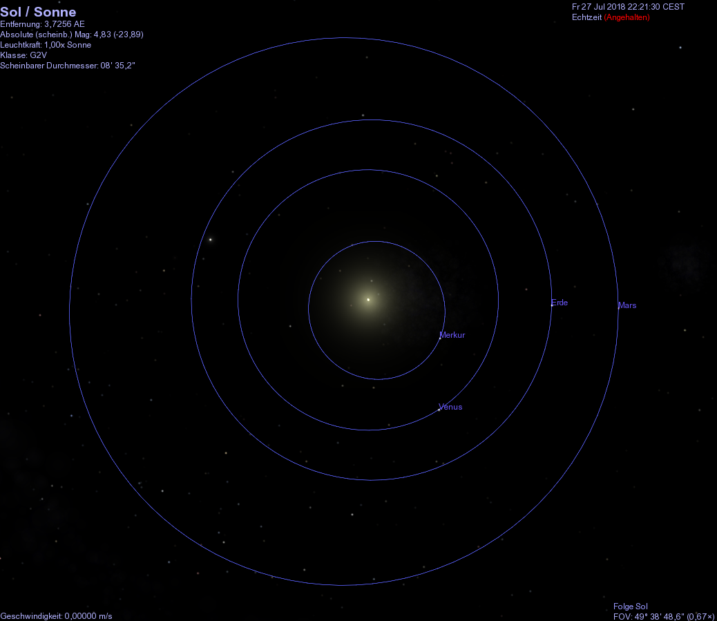 Der Planet Mars, der um 21:45 aufgeht, und am besten nach Mitternacht tief im Süden beobachtet werden kann, erreicht nur einen Tag später seine Oppositionsstellung und steht damit der Sonne gegenüber. In dieser Stellung kommen sich Erde und Mars etwa alle zwei Jahre nahe, die stark elliptische Bahn des Mars führt aber bei dieser Opposition zu einer besonders geringen Entfernung. Dabei wird Mars am Himmel besonders hell, noch heller als Jupiter. In Teleskopen erreicht Mars jetzt seine beste Beobachtungsmöglichkeit und er ist auch besonders groß. Im Teleskop auf der Sternwarte können bei guten Luftverhältnissen sogar Oberflächendetails gesehen werden. Erst in 17 Jahren wird Mars wieder ähnlich gut zu beobachten. Allerdings steht Mars sehr tief am Horizont und erreicht in der Nacht zu Samstag im Süden frühmorgens um 1:41 gerademal 16° Horizontabstand. Mars wird noch über den gesamten August und dann früher am Abend gut zu sehen sein.