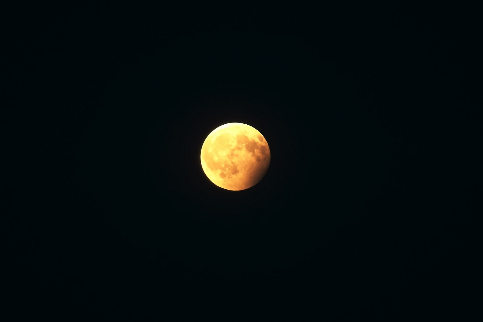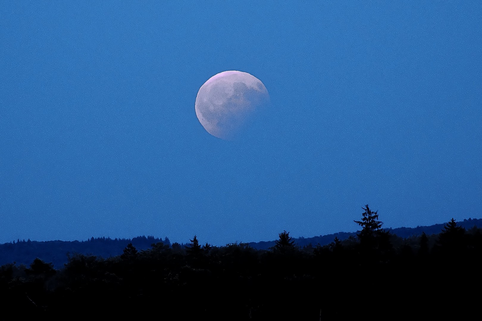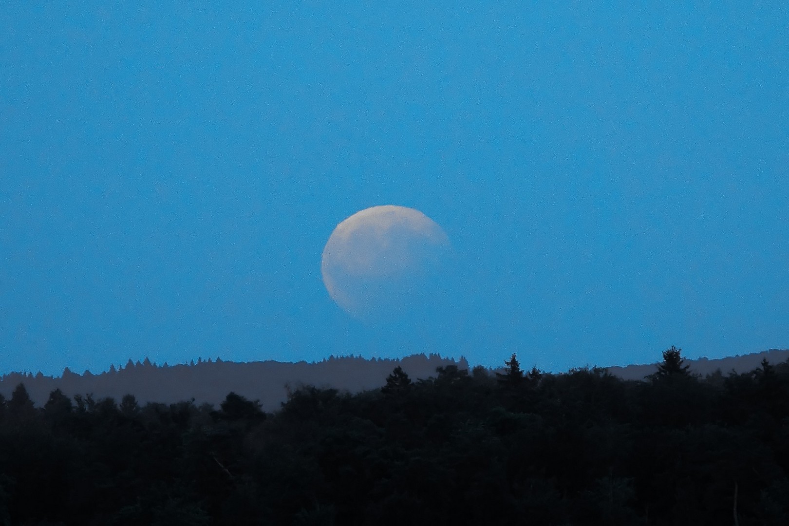 Zum Feierabend gibt es heute ein bisschen Mondfinsternis. Der Mond war wegen starkem Dunst erst sichtbar nachdem er komplett über dem Wald war.