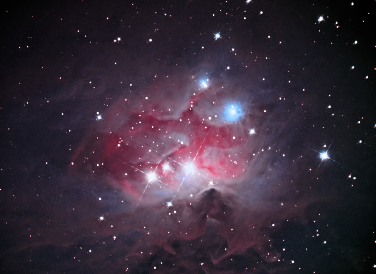 Im Sternbild Orion gibt es zahlreiche Gasnebel und Reflektionsnebel. Ein besonders schönes Beispiel ist der Nebel NGC1977, den unser Mitglied Harald Kaiser kürzlich fotografiert hat. (Gesamtbelichtungszeit 2h 18min, RC12 reduziert, Kamera ASI071, Copyright Harald Kaiser)